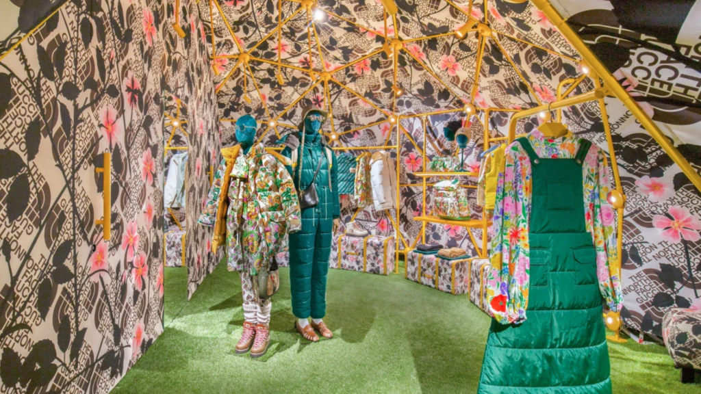 Dès l’entrée, les clients sont plongés dans un univers sensoriel étonnant : gazon synthétique moelleux, bruits de forêt en audio 8D, lumières tamisées, et projections nocturnes recréant une nuit étoilée. L’ambiance évoque une randonnée dans les Alpes… mais dans un écrin de luxe et de raffinement. La collection exclusive, mêlant vestes techniques, sacs à dos, doudounes colorées et accessoires vintage, complète parfaitement l’expérience.