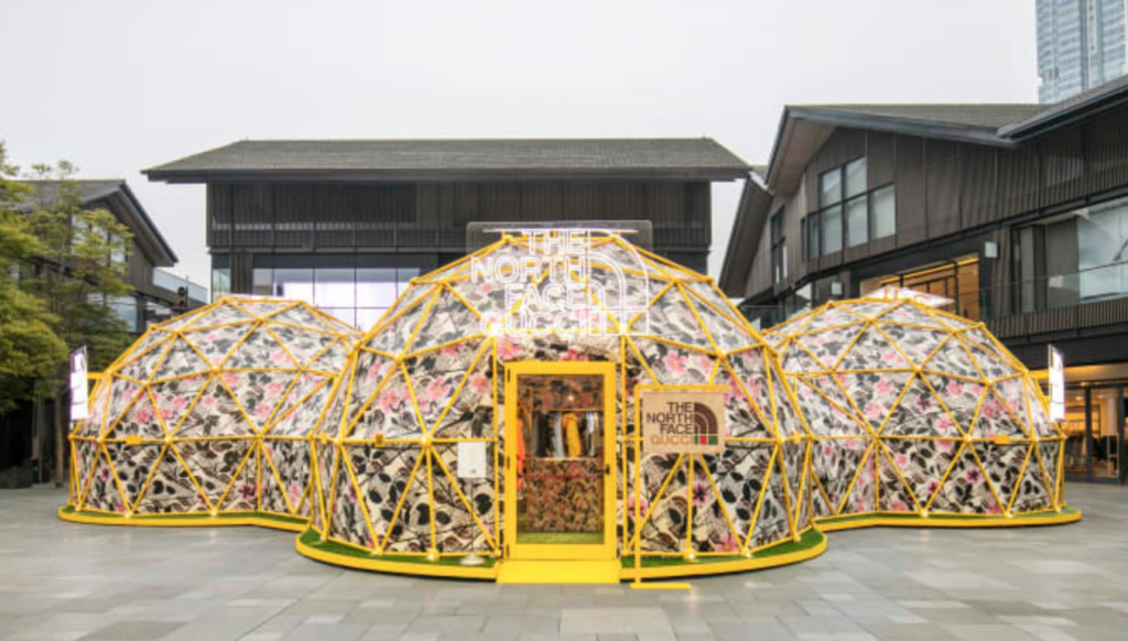 C’est en Chine, à Chengdu, que le premier Gucci Pin de cette collection exclusive voit le jour. Le pop-up store est pensé comme une tente de camping grandeur nature, avec un design spectaculaire signé Alessandro Michele, directeur artistique de Gucci. Objectif : offrir aux visiteurs une immersion totale dans la nature, en plein cœur de la ville.